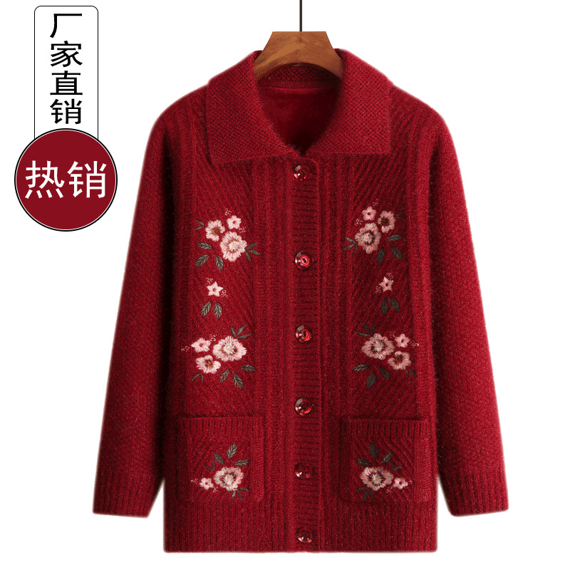 Sweater wanita paruh baya, pakaian Sweater ibu Musim Semi dan Gugur, kardigan lengan panjang bordir ukuran besar