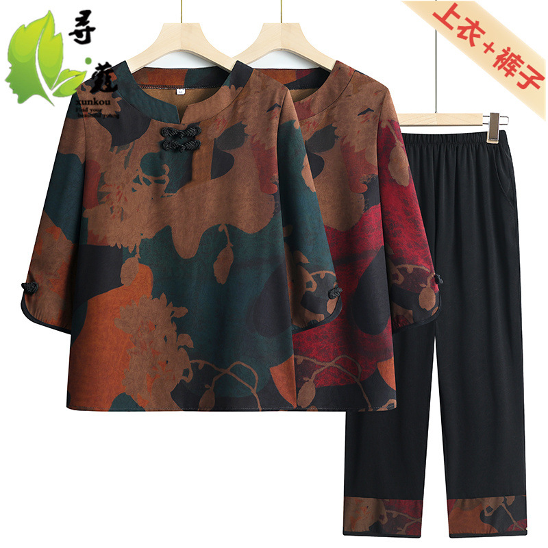 Kaus lengan tiga perempat musim panas ibu, atasan gaya Barat untuk usia sedang dan orang tua, setelan ukuran besar nenek musim semi dan musim panas kasual dua potong