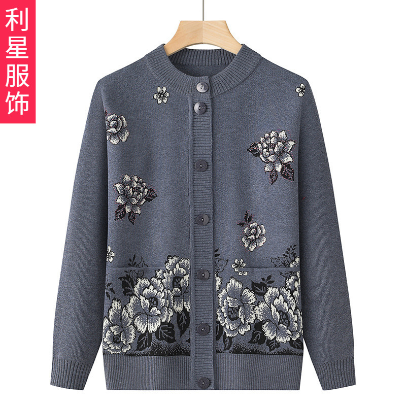 Wanita paruh baya dan lansia musim semi dan musim gugur sweter kardigan Nenek pakaian ibu musim gugur dan musim dingin pakaian rajut mantel leher bulat longgar