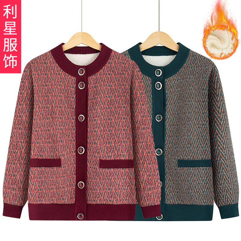 Mantel musim gugur dan musim dingin, pakaian hangat berlapis bulu untuk nenek, kardigan tebal, pakaian sweter ibu wanita tua dan lansia