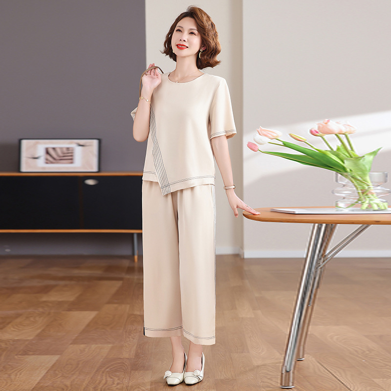 Setelan Ibu Modis Musim Panas 2025 Model Baru Pakaian Wanita Paruh Baya Atasan Pakaian Wanita Setengah Baya Pakaian Lengan Pendek Mulia Setelan Dua Potong