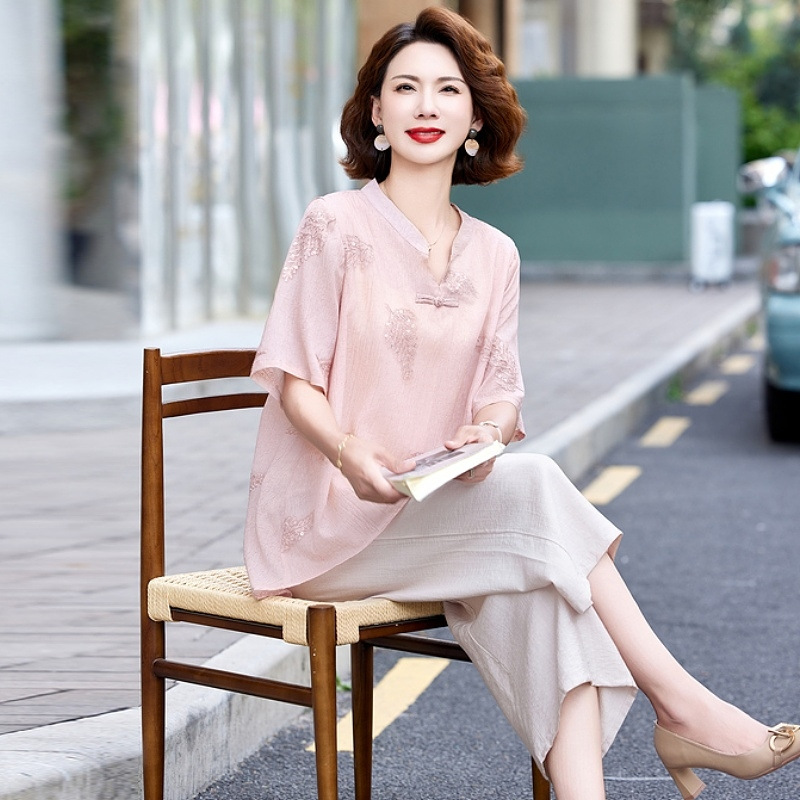 Pakaian Ibu Atasan Gaya Nasional Model Baru Musim Panas 2025 T-shirt Gaya Barat Kemeja Pakaian Wanita Setengah Baya dan Setengah Baya Kemeja Kecil Longgar Set