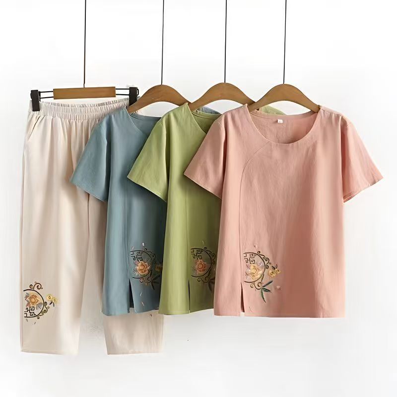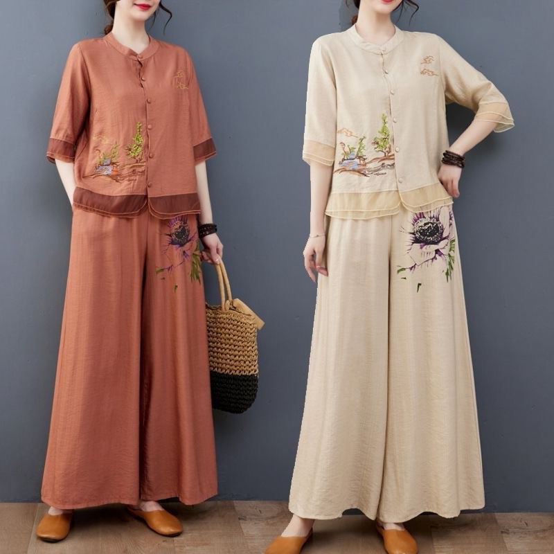 Pakaian Musim Panas Wanita Setengah Baya Dua Potong Atasan Lengan Sedang Katun Linen Bordir Bunga Pakaian Ibu Gaya Barat Pakaian Celana Kulot Modis Setelan