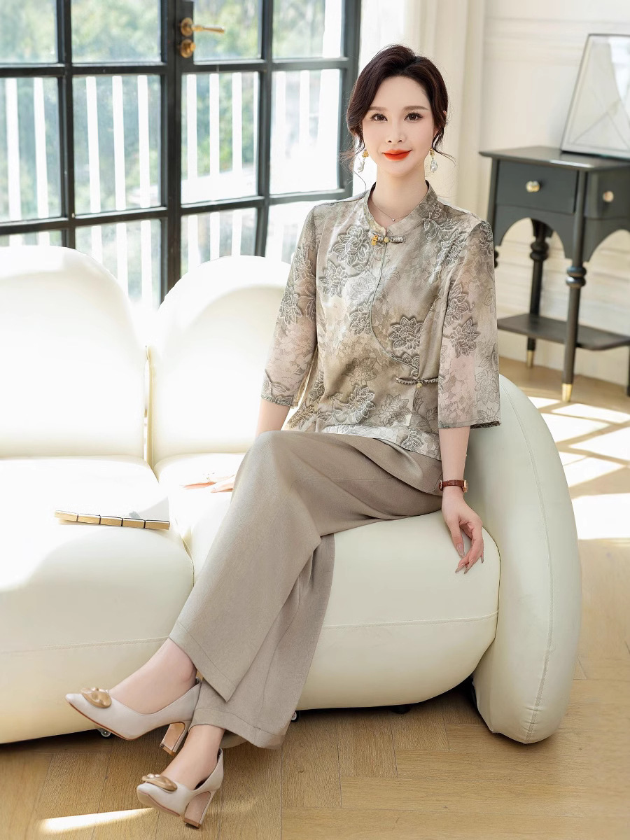 Pakaian Musim Panas Ibu T-Shirt Sutra Murbei Gaya Nasional Setelan 25 Set Dua Potong Kaki Lebar Sutra Wanita Setengah Baya dan Setengah Baya Model Baru