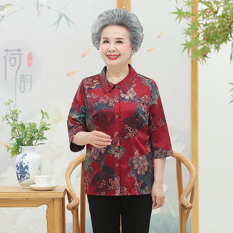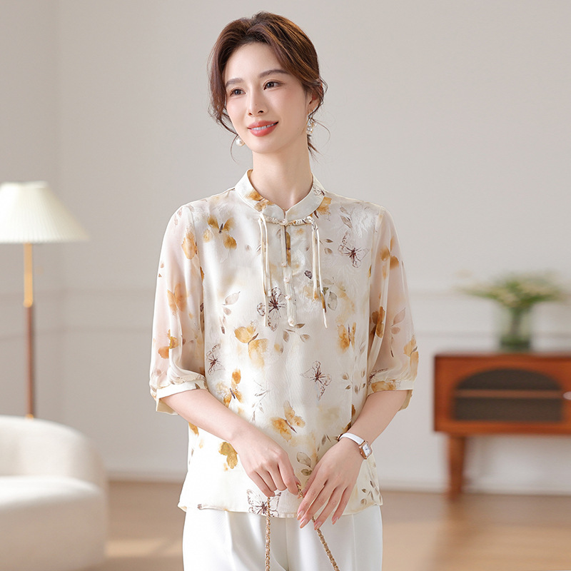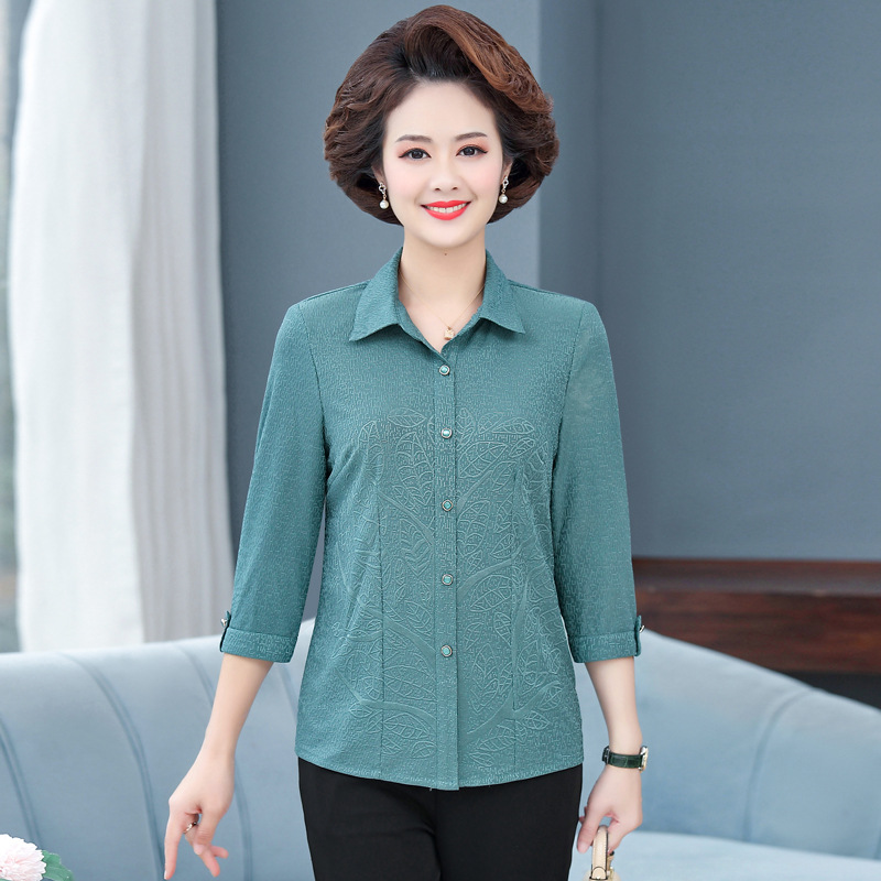 Ibu musim panas kemeja baru lengan tiga perempat kemeja wanita usia sedang kerah sutra buatan Atasan musim panas kemeja gaya Barat