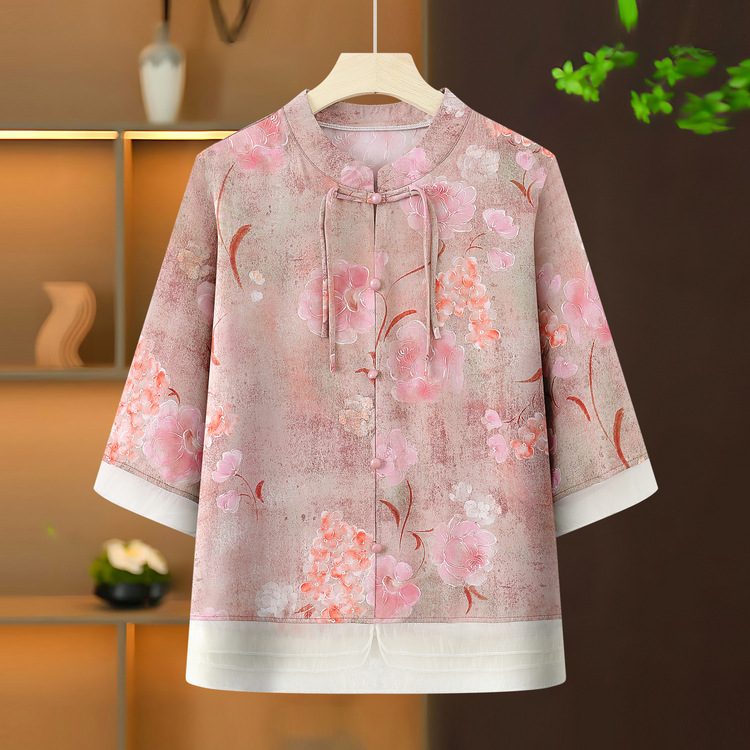 Pakaian Ibu Pakaian Musim Panas Model Baru 2025 Kemeja Lengan Pendek Elegan Atasan Gaya Cina Baru Musim Panas Wanita Setengah Baya