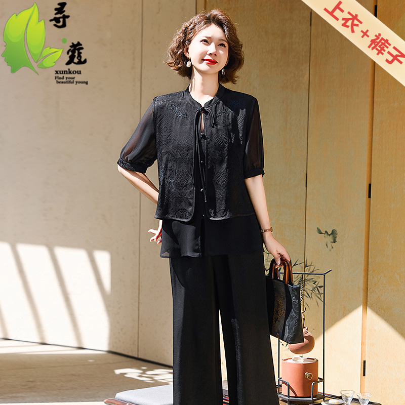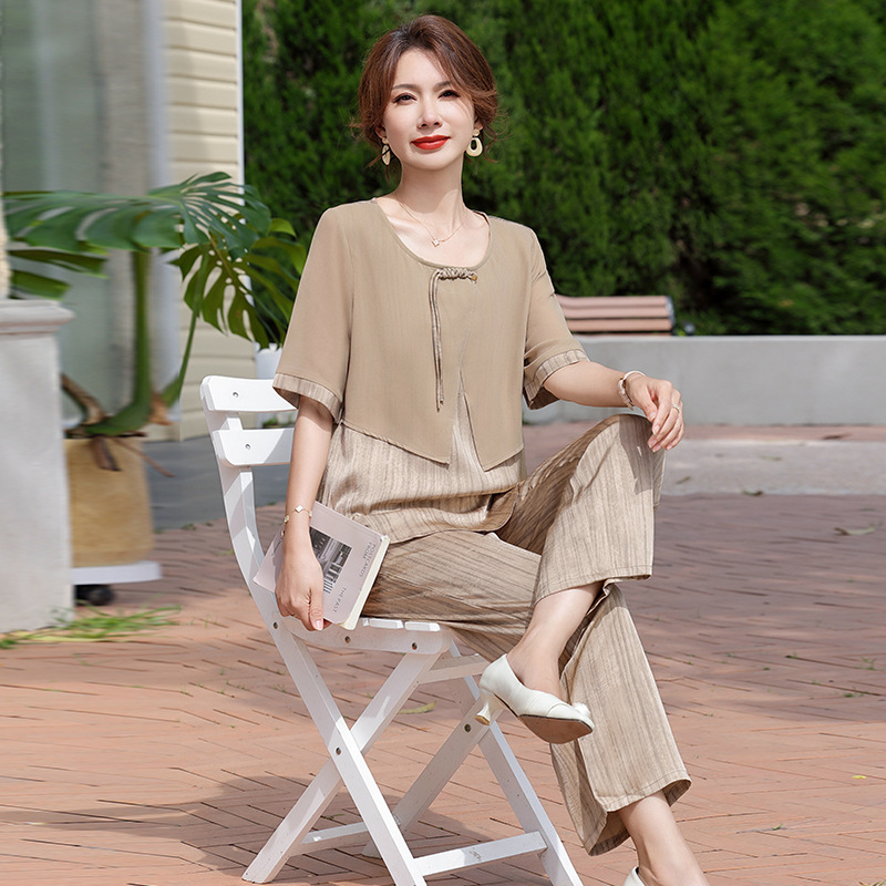 Setelan ibu musim panas yang elegan dan tipis, atasan lengan pendek dua potong untuk wanita, ukuran besar baru 2025, setelan kasual untuk usia paruh baya dan lanjut usia