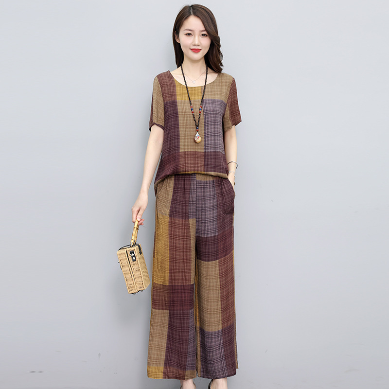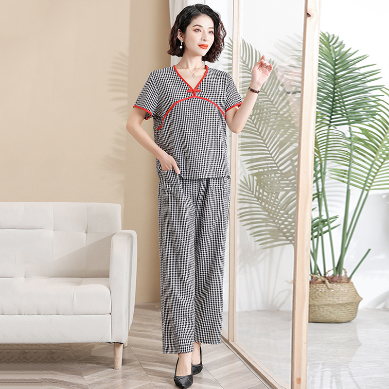 Setelan kotak-kotak wanita paruh baya dan lansia, setelan pakaian luar dua potong longgar kotak-kotak lengan pendek gaya China baru Musim Panas 2024