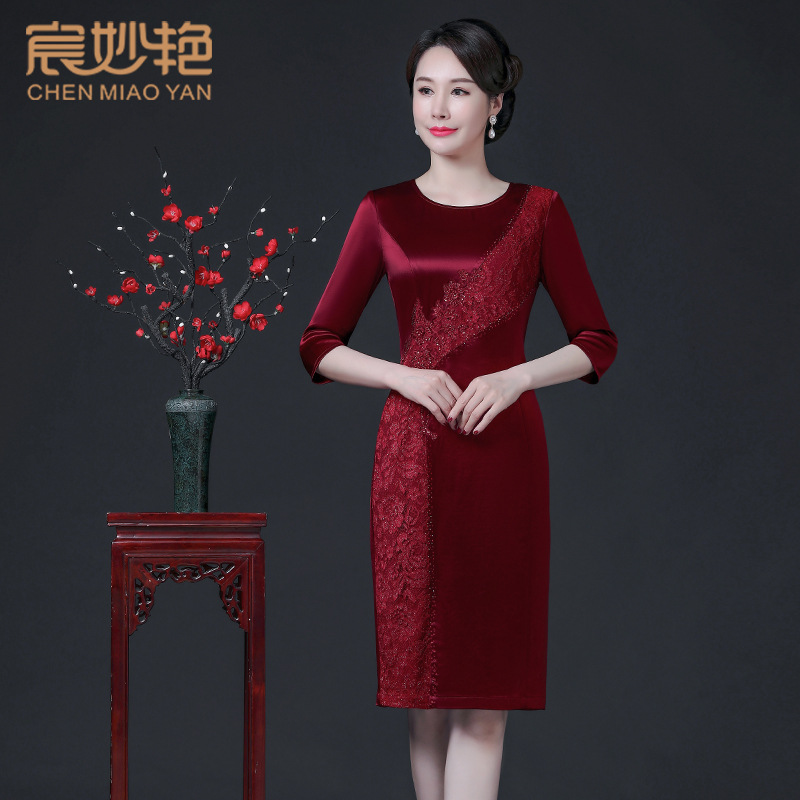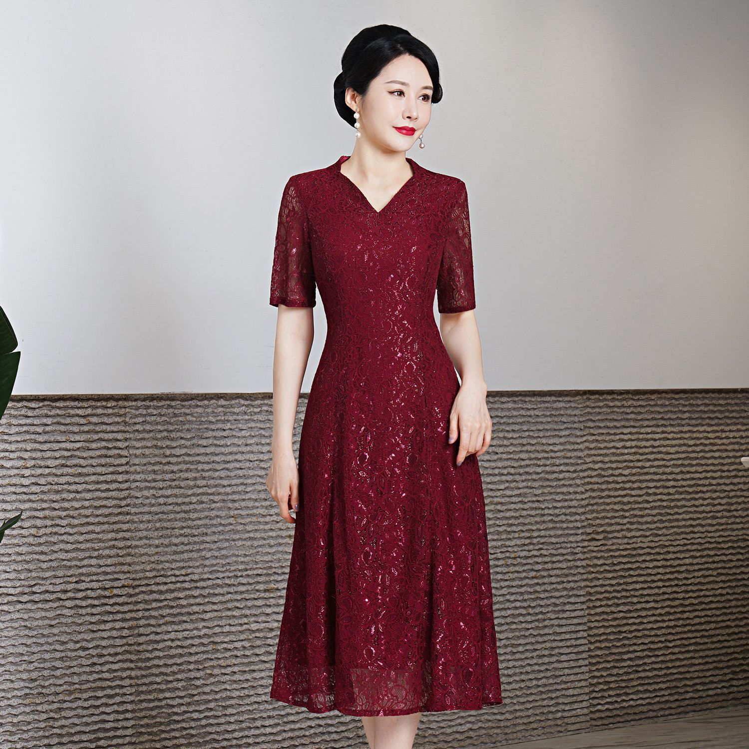 Gaun jamuan pernikahan mewah Shenzhen Gaun Wanita Xi mother-in-law musim panas ukuran plus gaun merah lengan pendek pengiriman satu potong