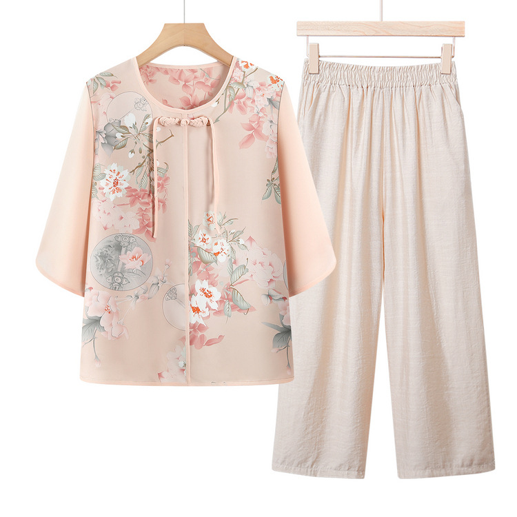 Pakaian Ibu Hari Ibu Setelan Musim Panas Kemeja Gaya Tiongkok Baru Pakaian Musim Panas Wanita Setengah Baya dan Setengah Baya Setelan Dua Potong Gaya Barat
