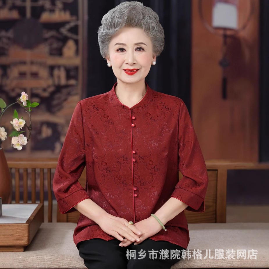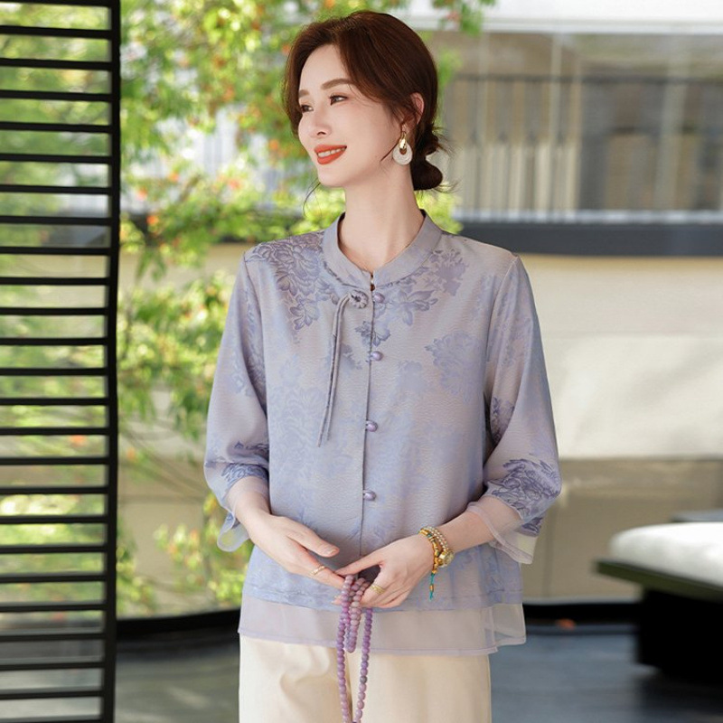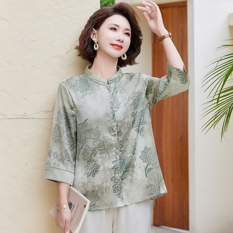 Pakaian Musim Panas Ibu Model Baru Kemeja Kecil Gaya Tiongkok Baru Atasan Gaya Barat Setengah Baya Wanita Modis Setengah Baya Lengan 3/4 Wanita