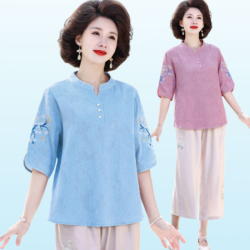 Ibu Setelan Dua Potong Kemeja Kerah Tegak Musim Panas Kemeja Kecil Lengan Sedang Gaya Nasional Hari Ibu Setelan Pakaian Wanita Setengah Baya dan Tua Ukuran Besar