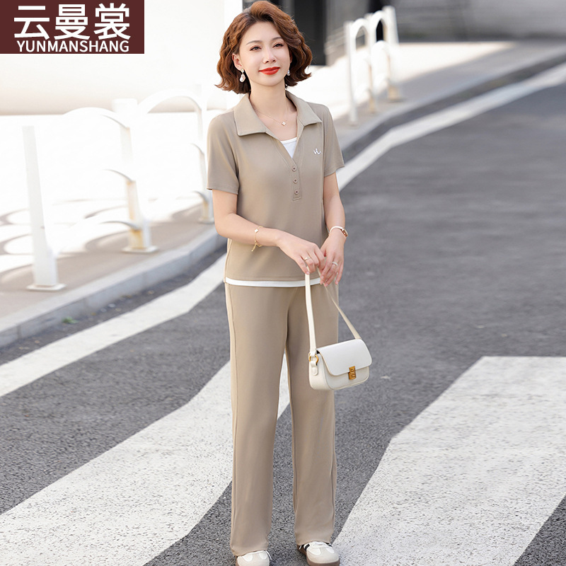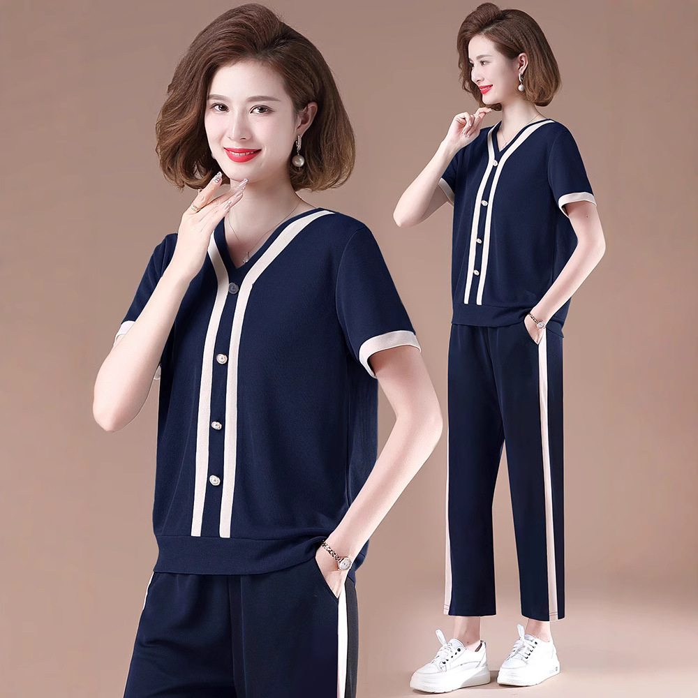 Setelan Pakaian Olahraga Musim Panas Ibu Setengah Baya Setelan Dua Potong T-shirt Lengan Pendek Musim Panas Wanita Setengah Baya dan Tua Model Baru 2025 Gaya Barat