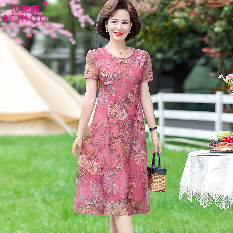 Gaun musim panas wanita paruh baya, gaun ibu gaya Barat usia 40-50 tahun, rok jala Taiwan, pakaian lebar temperamen