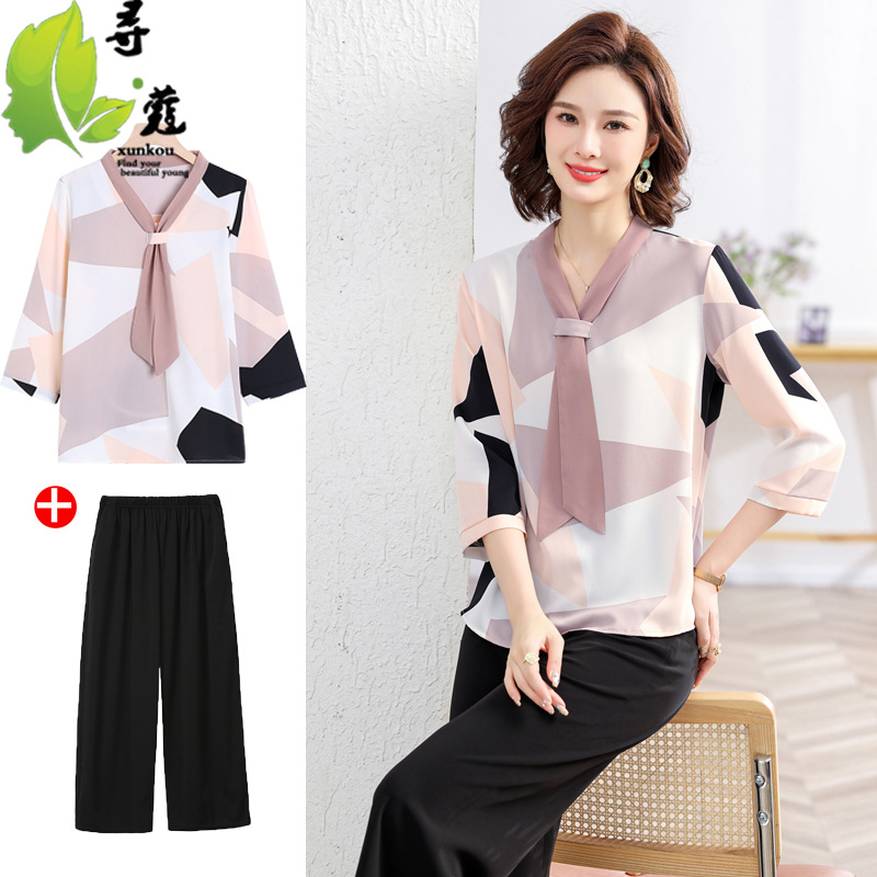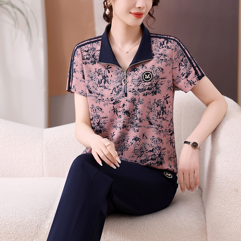 Setelan Fashion Mulia Gaya Barat Merek Nyonya Kuo Setelan Kasual Bermotif Lengan Pendek untuk Ibu Paruh Baya Musim Panas