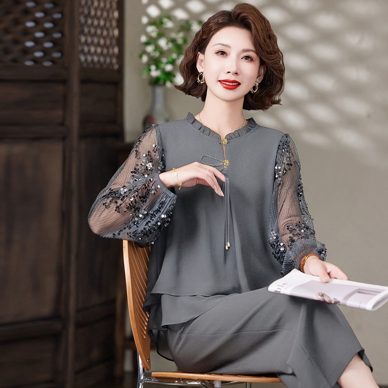 Setelan Musim Panas Ibu Gaya Barat Setelan Dua Potong Kemeja Lengan Kasa Musim Panas Setengah Baya dan Lansia Model Baru 2025 Elegan