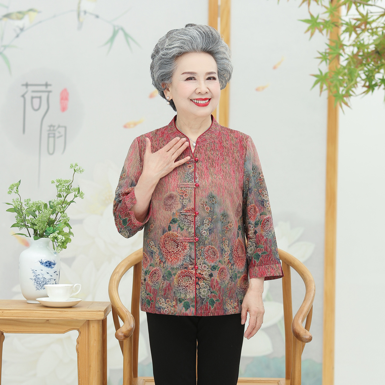 Pakaian wanita paruh baya dan lansia, pakaian musim semi dan musim gugur kemeja tipis longgar pakaian ibu Atasan 60 tahun 70