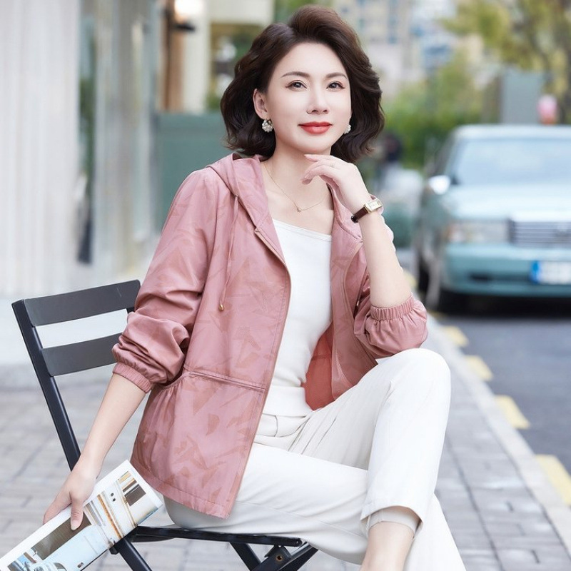 Pakaian Wanita Setengah Baya dan Tua Modis Atasan Bertopi Kasual Musim Semi dan Musim Gugur Jaket Model Tipis Ibu Jaket Musim Semi Pakaian Pelindung Terik Usia Gaya Barat