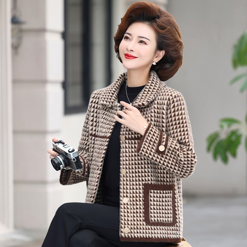 Ibu mantel beludru tebal mink pendek musim semi mantel wanita usia sedang wol gaya Barat atasan rajut musim gugur