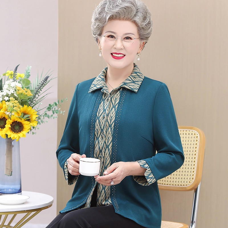 Pakaian musim semi nenek atasan pakaian musim gugur tua baju wanita usia 60-70 tahun baju lengan panjang ibu gaya Barat wanita