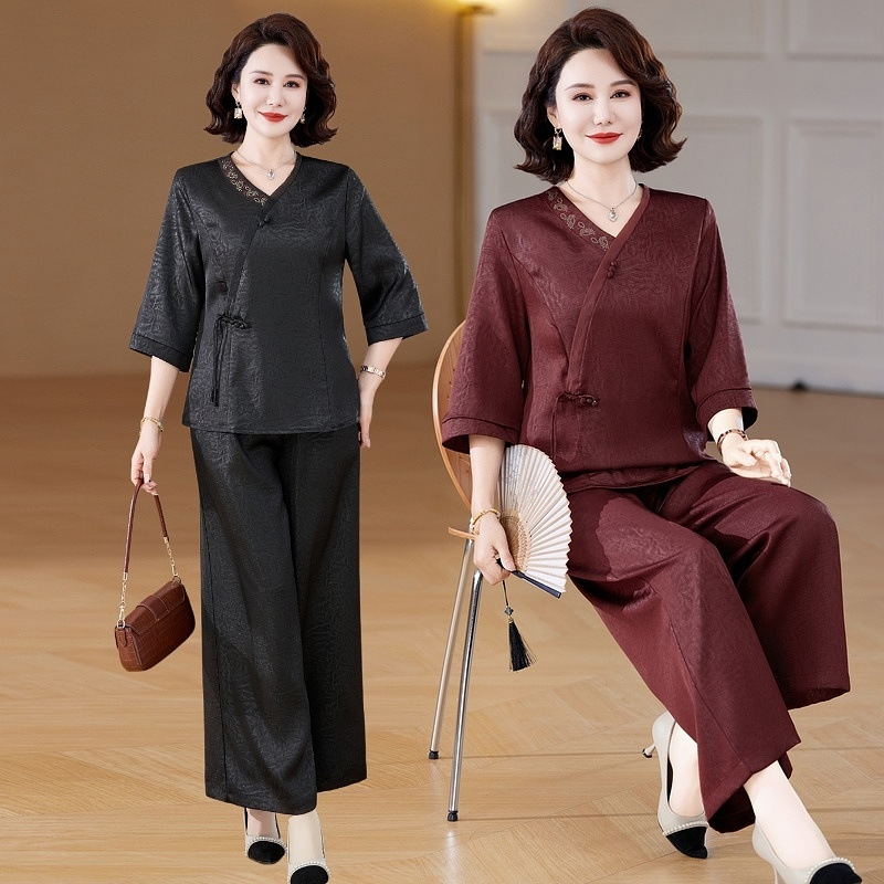 Pakaian Musim Panas Ibu Mengurangi Usia Berkualitas Tinggi Musim Panas Model Baru Model Tiongkok Model Baru 2025 Pakaian Atasan Wangi Celana Lebar Dua Potong