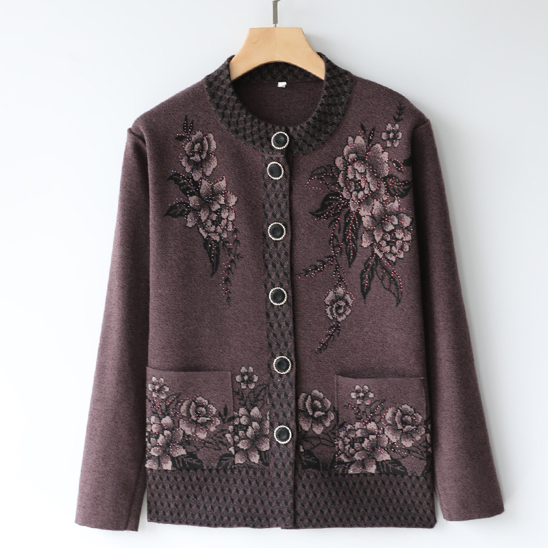 Kardigan musim gugur ibu atasan nenek leher bulat sweter bunga berlapis bulu tebal usia sedang dan orang tua pakaian musim gugur