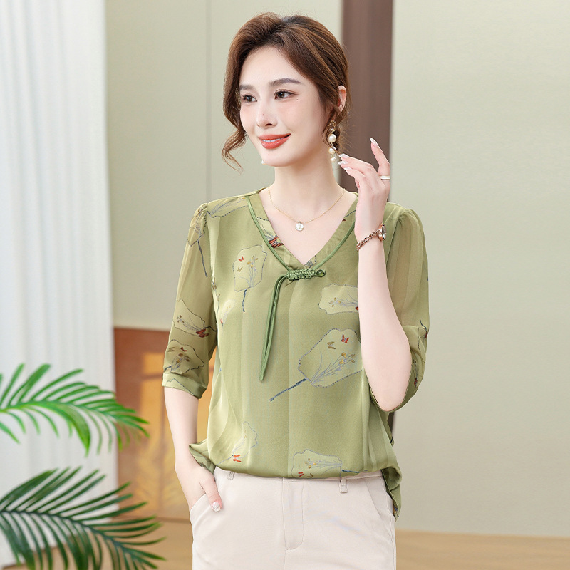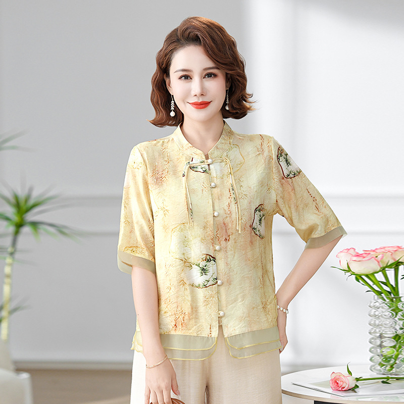 Setelan pakaian musim panas ibu gaya Tiongkok, Atasan kemeja panjang sedang untuk wanita paruh baya dan lansia musim semi dan musim panas lengan tiga perempat