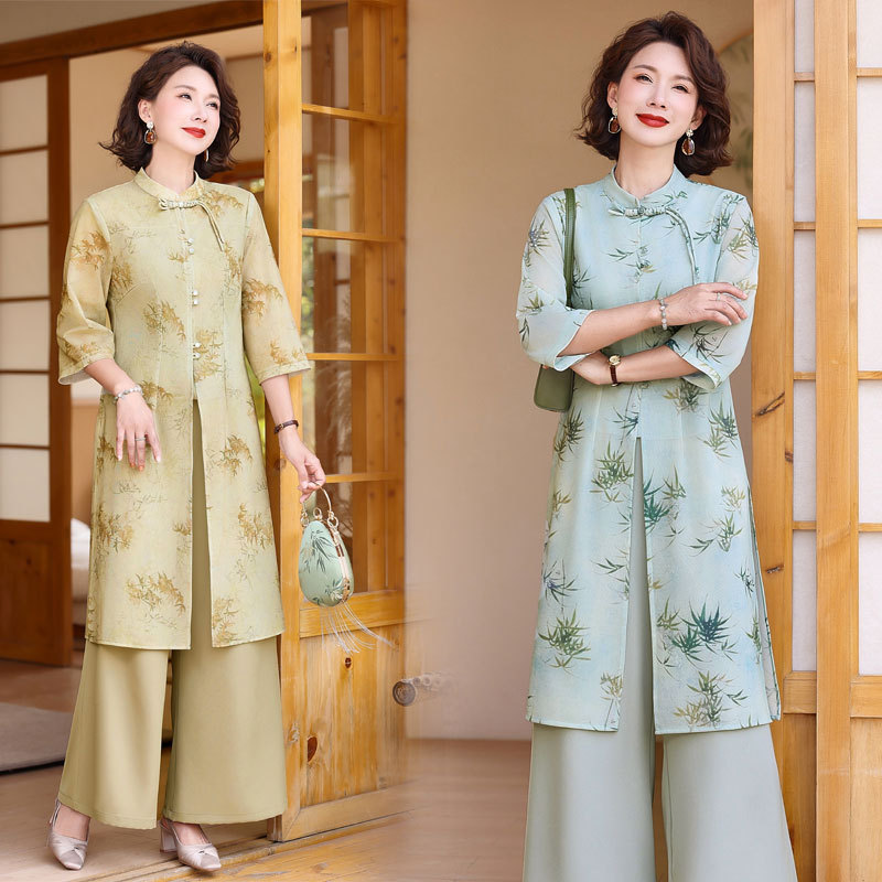 Pakaian Ibu Hari Ibu Kemeja Kecil Elegan Set Dua Potong Kemeja Gaya Nasional Model Baru Musim Panas 2025 Set Pakaian Wanita Setengah Baya