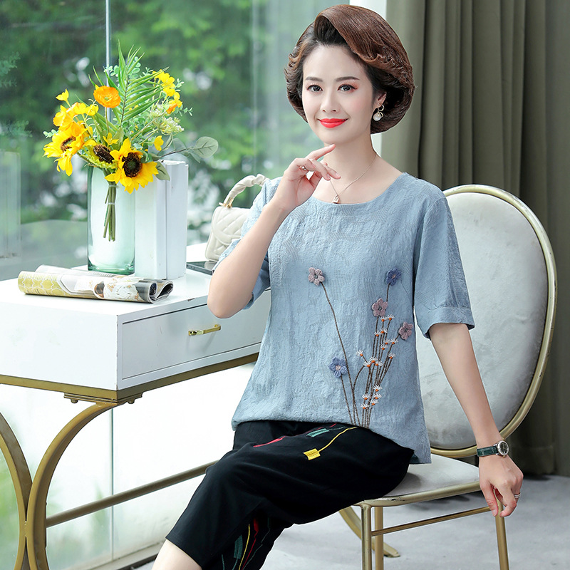 Setelan pakaian musim panas untuk ibu, setelan pakaian musim panas katun dan linen atasan gaya Barat, kaus lengan pendek usia 50 tahun dan lansia, setelan dua potong modis