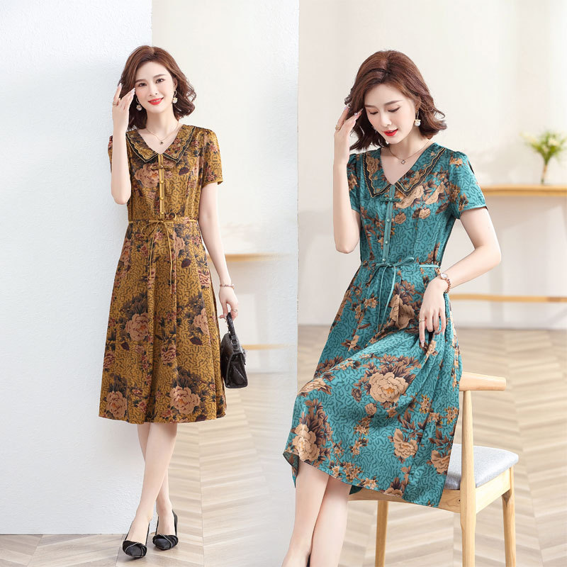 Gaun modis ibu, gaun musim panas 2023 baru 40 tahun 50 usia sedang lengan pendek wanita lebar terhormat rok atas lutut