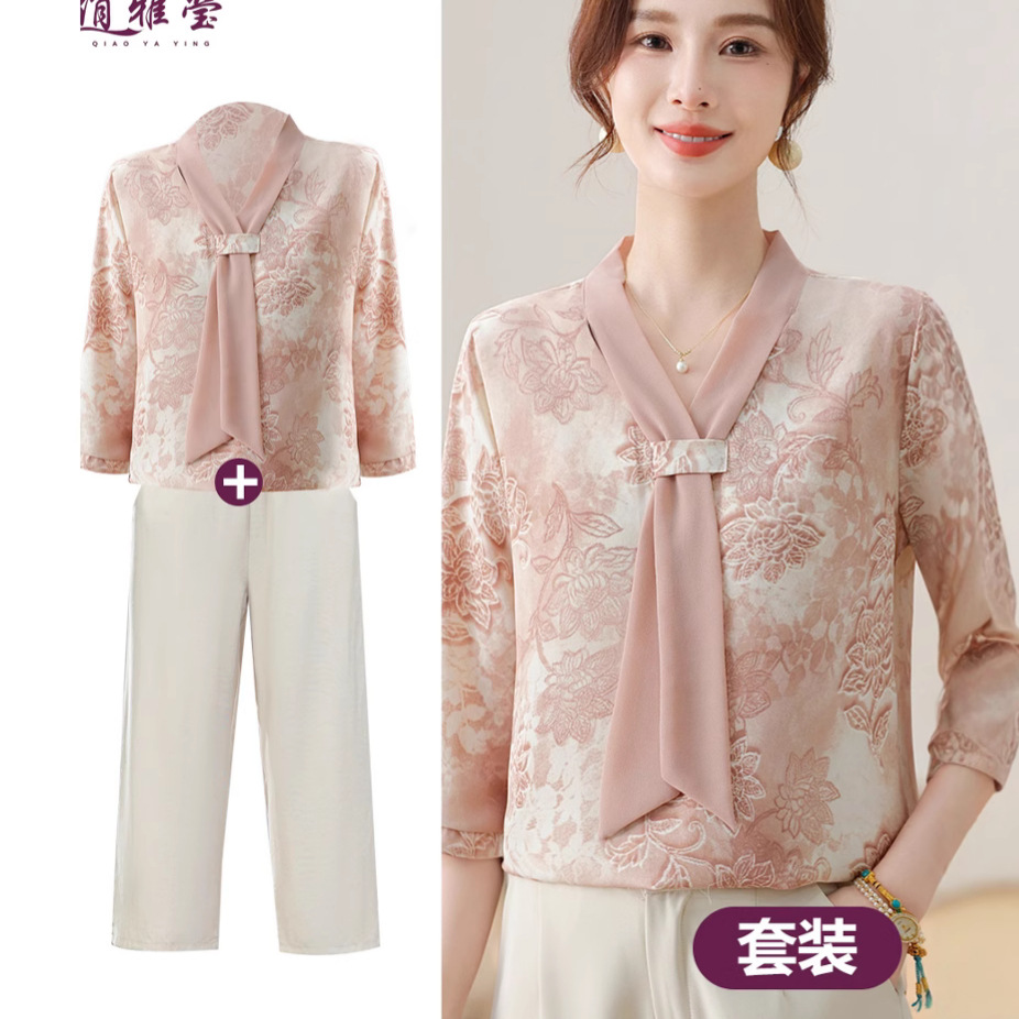 Pakaian Ibu Setengah Baya Musim Panas Model Baru Bercorak Baju Atasan Lengan Sedang Tipis Wanita Mulia Pakaian Wanita Setengah Baya Setelan Dua Potong