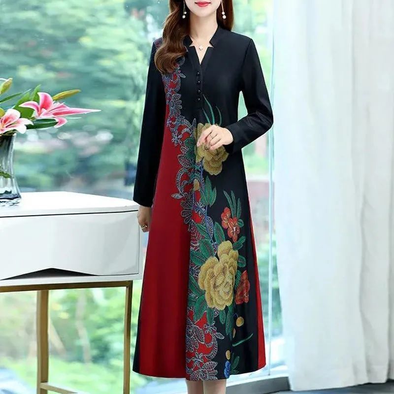 Gaun lengan panjang untuk wanita, pakaian ibu baru musim semi dan musim gugur gaya Barat kerah v panjang mulia lebar, gaun lengan panjang bermotif untuk wanita