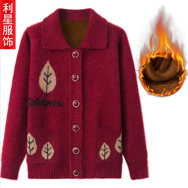 Sweater wanita paruh baya dan lansia, pakaian hangat Ibu musim gugur dan musim dingin, kardigan berlapis bulu tebal, mantel hangat