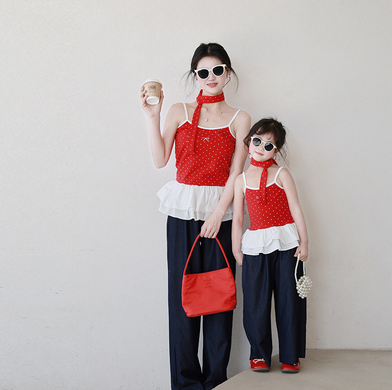 Pakaian Ibu dan Anak Bersama Musim Panas Model Baru Baju Atasan Tali Balet Poltot Retro Baju Selempang Bisa Disesuaikan