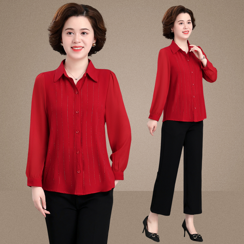 Kemeja wanita paruh baya musim semi dan musim gugur, kemeja merah modis untuk wanita paruh baya dan lansia, kemeja lengan panjang