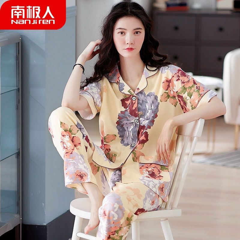 Setelan Katun Sutra Luar Manis Model Baru Baju Tidur Katun Lengan Pendek Wanita Musim Panas Pakaian Rumah Tangga AC Ukuran Besar Model Ibu