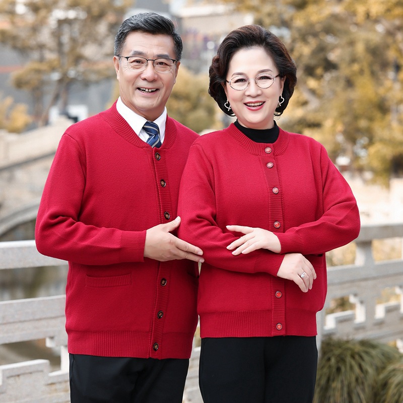 Festival Musim Semi Tahun Baru pakaian paruh baya dan tua sweater wol kakek dan nenek sweater kardigan pasangan sweter tebal mantel pakaian ibu