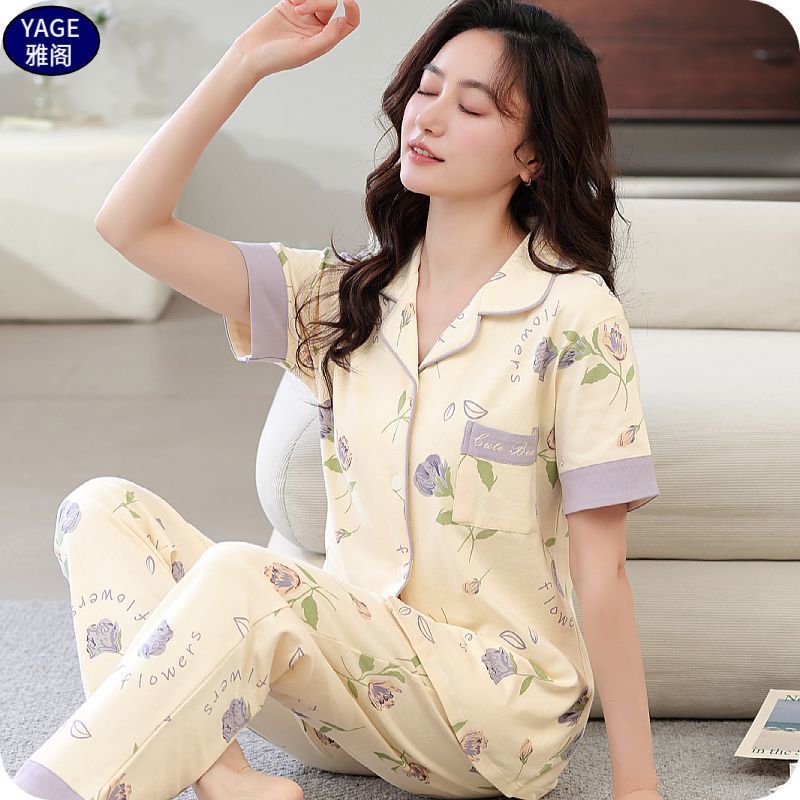 Baju Tidur Katun Murni Wanita Musim Panas Celana Panjang Lengan Pendek Kardigan Ibu Setengah Baya Pakaian Rumah Model Tipis Luar Musim Panas