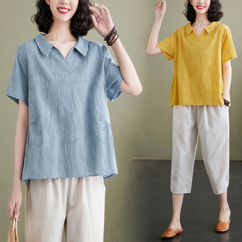 Pakaian Musim Panas Foto Solid Setelan Katun Linen Pakaian T-shirt Lengan Pendek Gaya Barat Baju Atasan Ibu Model Rata Sederhana Setelan Dua Potong