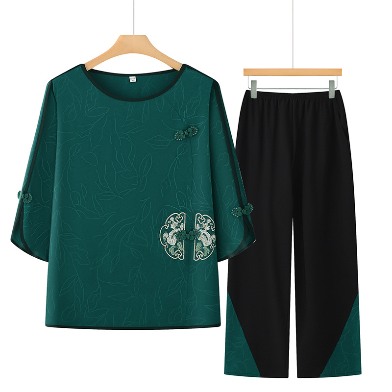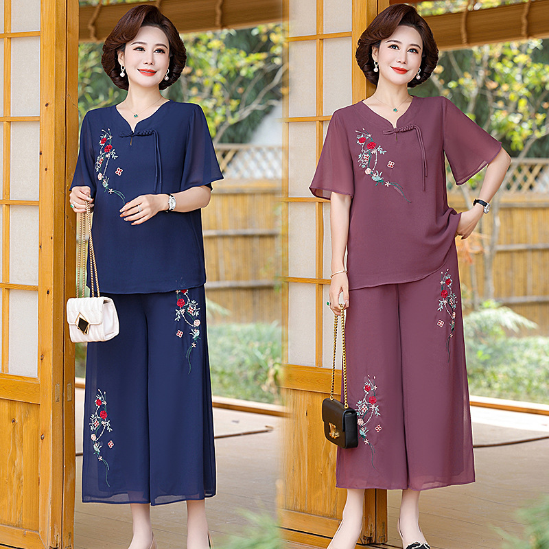 Setelan dua potong ibu 2024, setelan sifon bordir gaya nasional wanita usia sedang dan orang tua wanita usia 50 tahun longgar musim panas baru