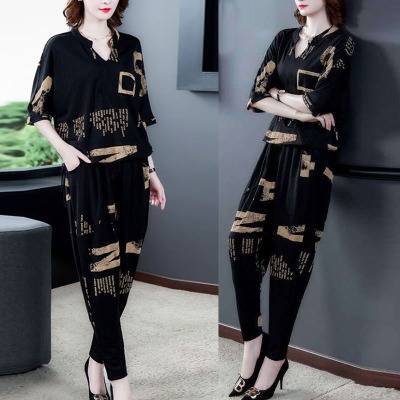 Celana panjang setengah lengan, kardigan leher bulat sutra es, pakaian rumah musim panas untuk ibu dan orang tua modis pengiriman satu potong