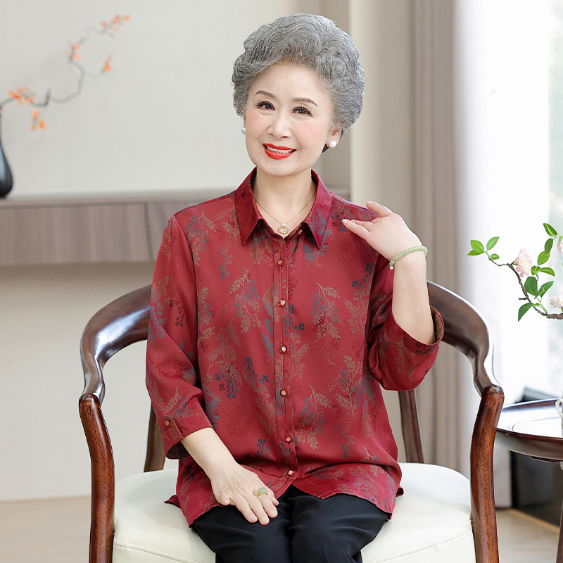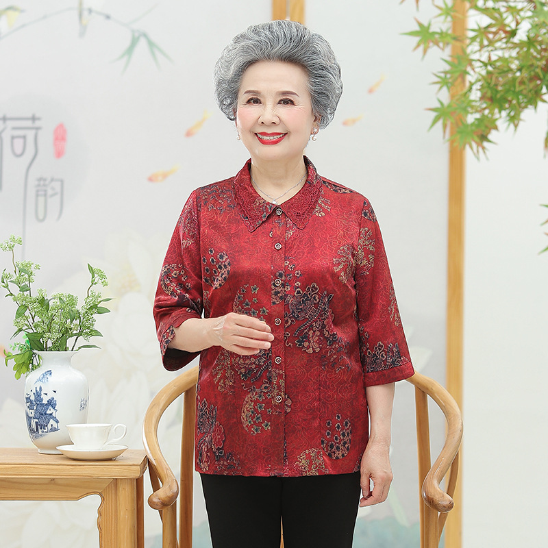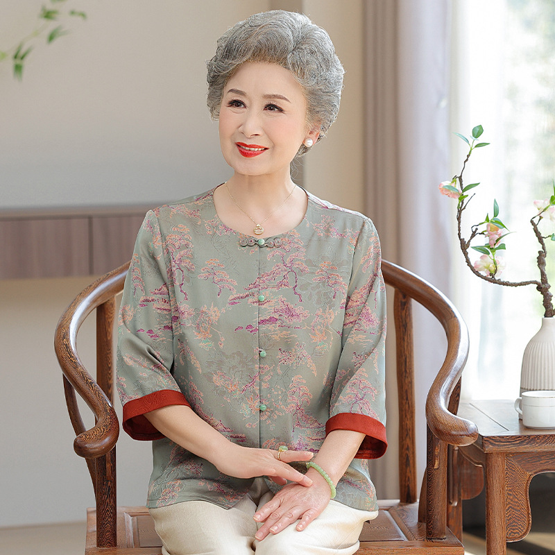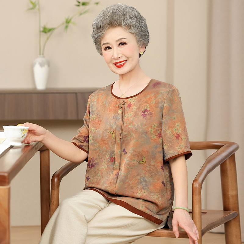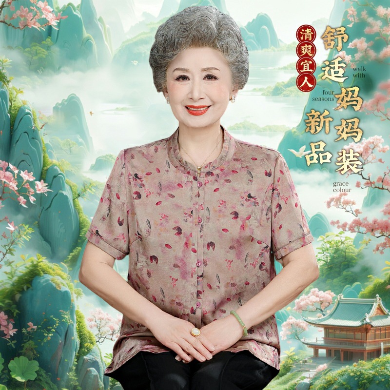Kemeja Musim Panas Nenek Wanita Paruh Baya Musim Panas Ringan Mewah Kemeja Mulia 60 Tahun 70 Pakaian Ibu Sutra Imitasi