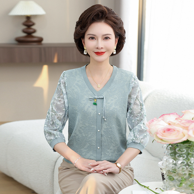 Setelan pakaian musim semi untuk ibu kaos kecil rajut wanita paruh baya atasan gaya Barat baru kaos lengan panjang orang tua musim panas