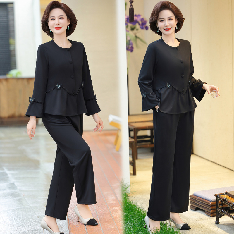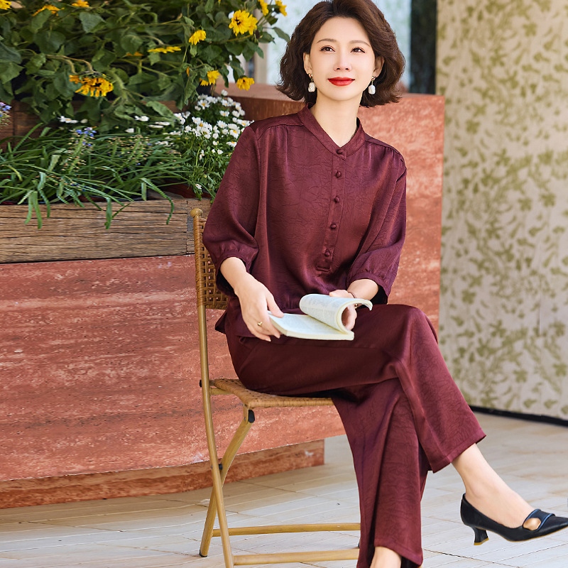 Pakaian Musim Semi Pakaian Wanita Setengah Baya dan Tua Setelan Model Baru 2025 Baju Kecil Mengurangi Usia Daging Xizang Celana Kaki Lebar Dua Set Pakaian Ibu Trendi