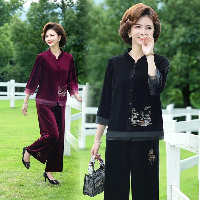 Pakaian musim semi untuk ibu beludru emas setelan 60 tahun wanita usia sedang dan tua musim semi dan musim gugur mantel fashion nenek kasual setelan dua potong