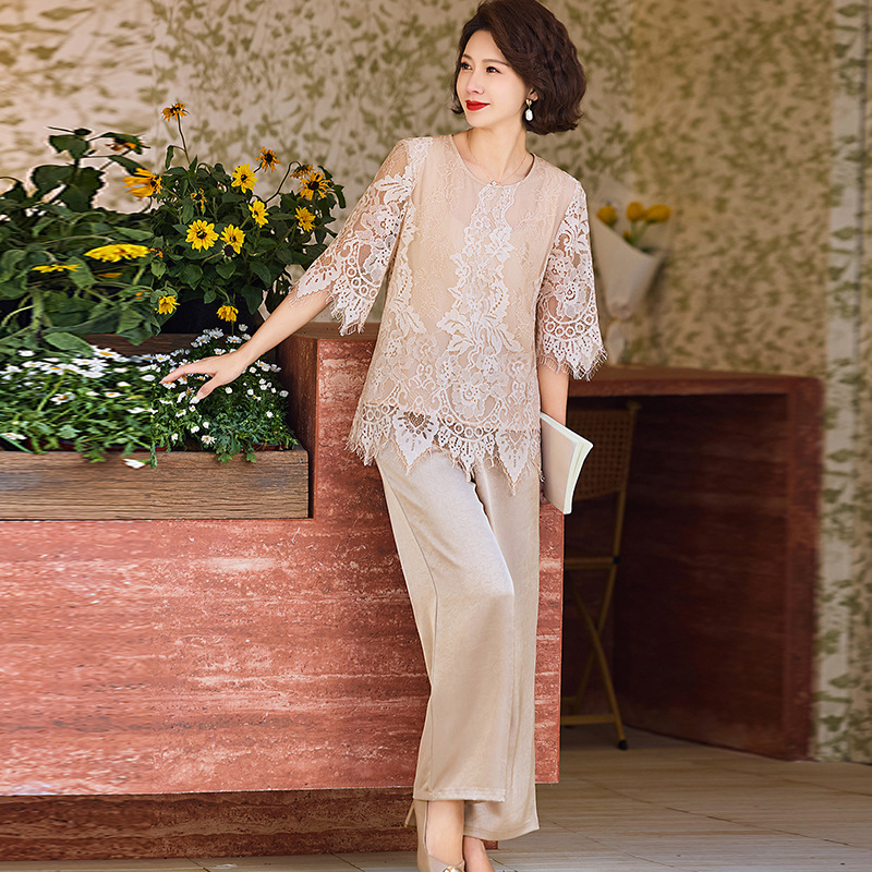 Pakaian Ibu Setelan Musim Panas Celana Kaki Lebar Terlihat Kurus Longgar Model Baru Modis Setengah Baya Elegan Gaya Barat Santai Dua Set