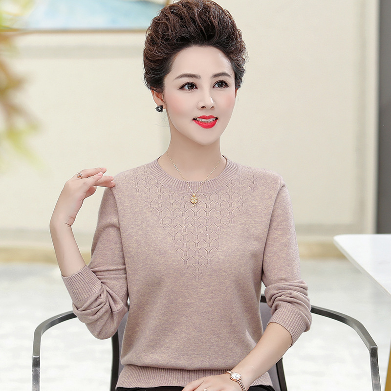 Sweater wanita paruh baya dan lansia, kemeja Dalaman longgar leher bulat warna polos gaya Barat baru, pakaian ibu 2024