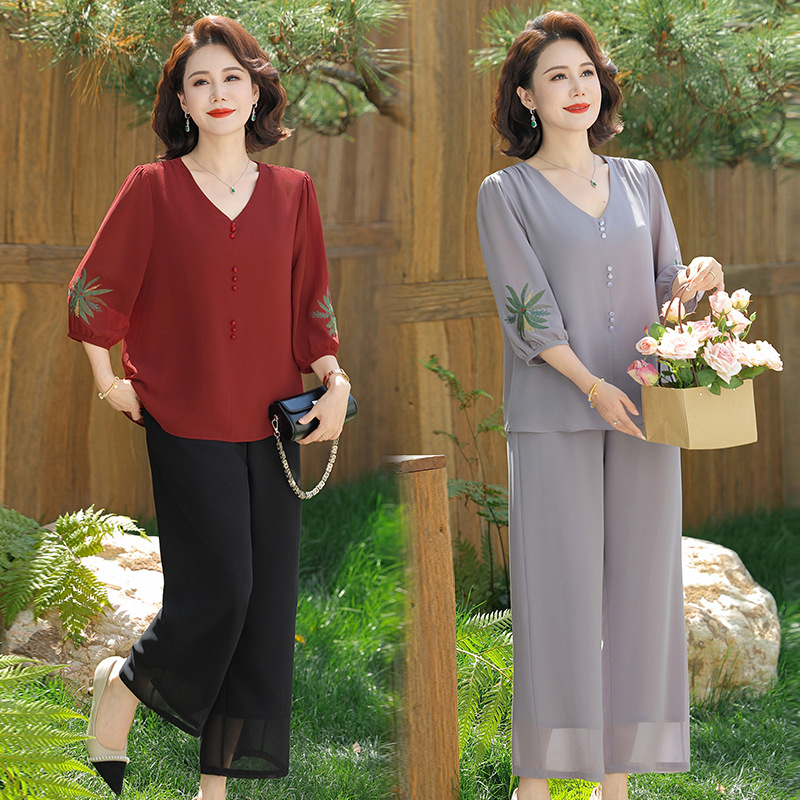 Setelan pakaian ibu, baju sifon lengan pendek dan lansia, temperamen modis dua potong set 40 tahun 50 ukuran besar lengan pendek musim panas