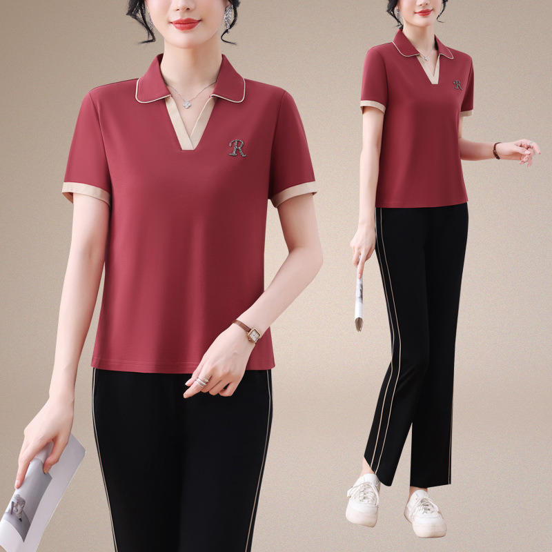 Pakaian Musim Panas Ibu Setengah Baya Setelan Modis Model Baru Pakaian Wanita Setengah Baya Gaya Barat Atasan T-shirt Lengan Pendek Set Dua Potong 50 Tahun