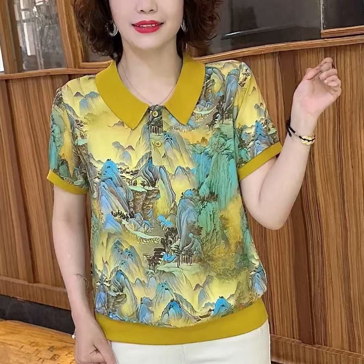Kaus Lengan Pendek Lukisan Pegunungan Elegan Modis Kemeja Kecil Gaya Barat Desain Kerah Boneka Pakaian Ibu Model Baru Musim Panas 2025